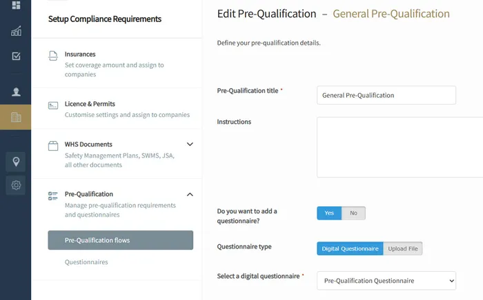 Assess contractors before engagement using configurable pre-qualification forms and questionnaires to capture key business and safety information upfront.