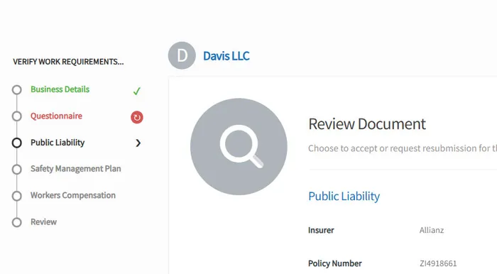 Automatically verify contractor compliance by reviewing submitted documentation, certifications, and questionnaire responses against your defined criteria.