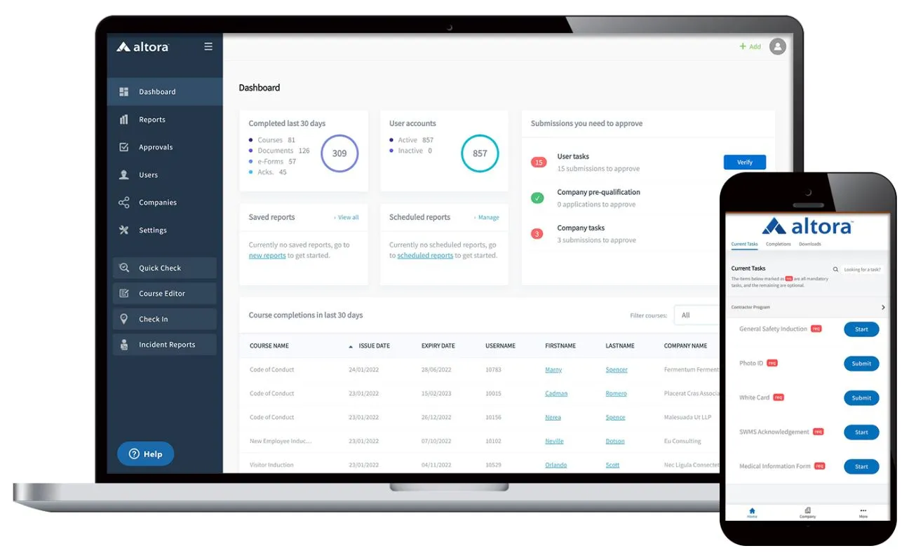 WHS compliance training will vary depending on the nature of the business and industry. By conducting regular training, education in policies and procedures, you can use Altora’s online induction software to assessing workers understanding, and track progress or completion of online training, and monitor through real-time reporting.