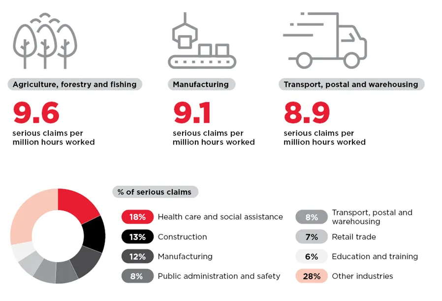 There were 120,355 serious compensation claims in 2020, with a median compensation of $13,500 per claim. 18% of these serious claims occur as a result of an incident in the Healthcare sector, followed by 13% in the Construction sector, and 12% from Manufacturing.