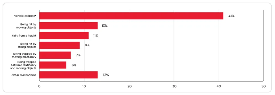 Workers were more likely to suffer a fatality as a result of a vehicle collision, representing 41% of overall numbers. Vehicle collisions include fatalities that occurred as a direct result of a vehicle crash - including cars, trucks, aircraft, boats, loaders, tractors and quad bikes.