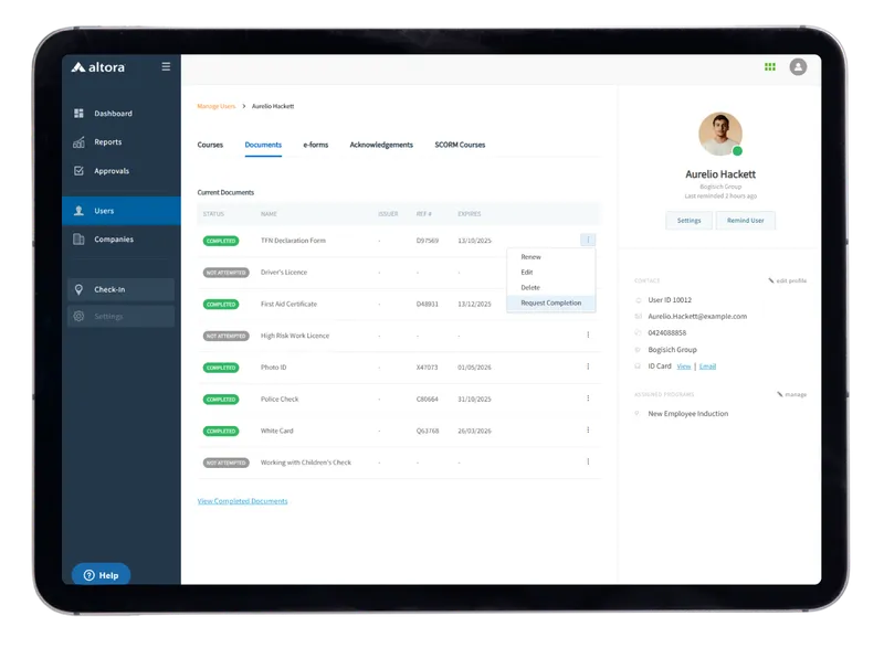 Management of the paperwork surrounding induction can be a challenge. Altora helps businesses to collate course information, licences and documentation in one central location that’s easily accessible and continually updated. You’ll be notified to act when licences expire, or training is due, requiring no additional steps.