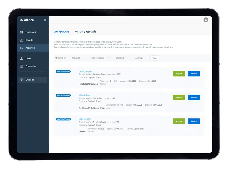 With no limit on users, Altora’s onboarding software is designed to scale as you do. Our three intuitive products - Induction Software, Contractor Management System and Sign-In Software, work together to provide you with the ultimate compliance and risk management system.